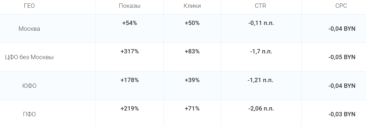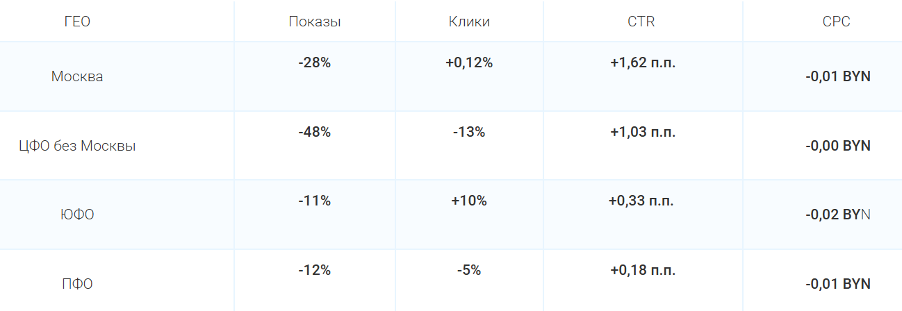 Из таблицы видно: несмотря на снижение количества показов, кликабельность объявлений выросла, а средняя стоимость перехода незначительно снизилась.